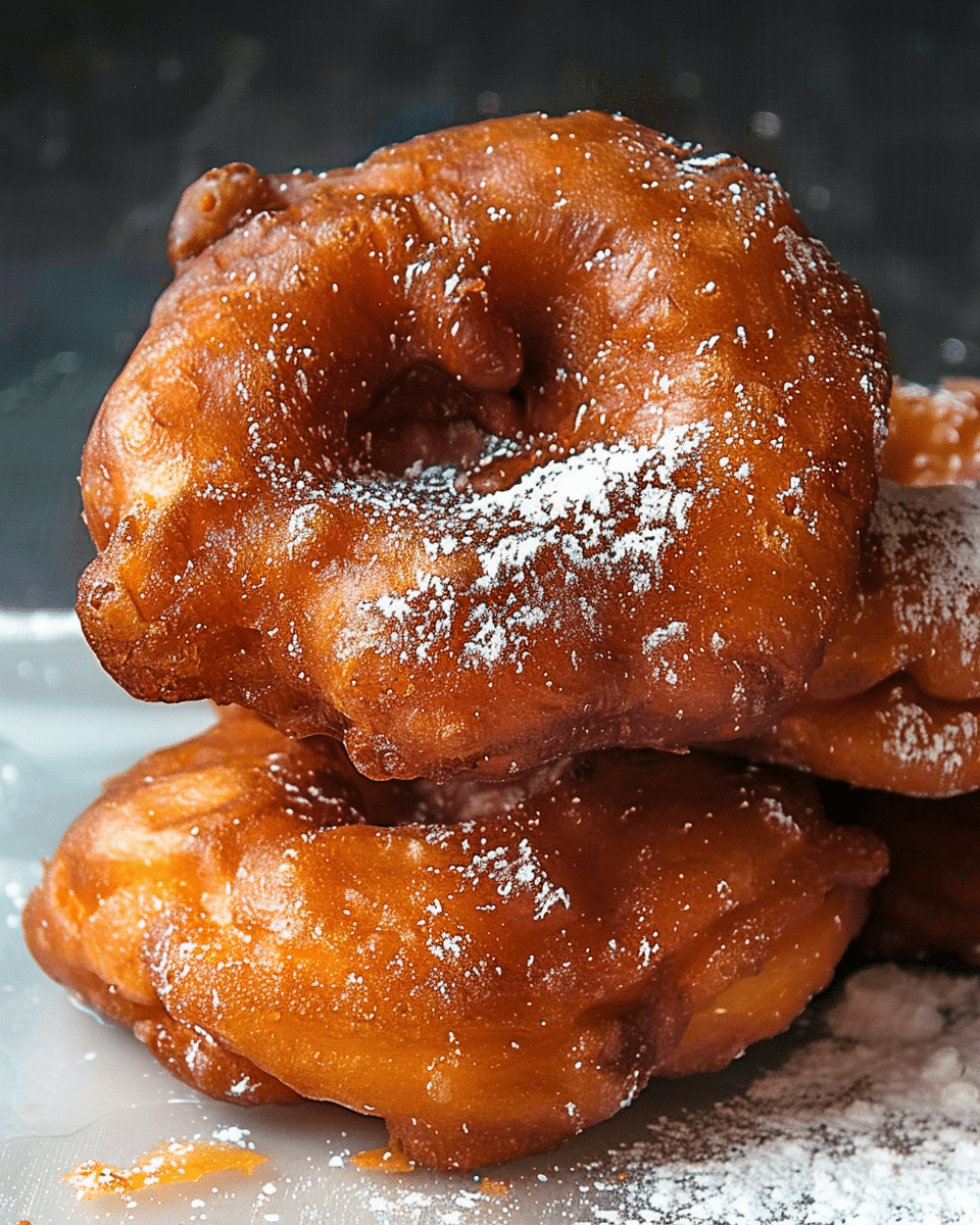 Traditional Bavarian apple fritters (Apfelkrapfen) made with apple rings dipped in a fluffy batter, deep-fried until golden, and served warm with cinnamon sugar or vanilla sauce.