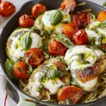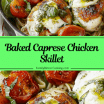 This baked Caprese chicken skillet is a simple yet impressive recipe that highlights the best of Italian flavors. With juicy chicken, creamy mozzarella, fresh tomatoes, and basil pesto, every bite is full of comfort and freshness. Served over pasta, it makes for a satisfying family dinner or an elegant meal for entertaining.