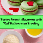 Celebrate the holiday season with these festive and delightful Grinch Macarons. Crisp and chewy almond meringue shells are tinted green and sandwiched with luscious red buttercream frosting, finished with charming red heart sprinkles to emulate the Grinch’s unforgettable style. Perfect for holiday parties or gifting, these macarons combine classic French technique with playful seasonal cheer.