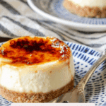 These mini cheesecakes freeze well if you want to prepare them ahead of time. Freeze before brûlée-ing the tops, wrapping each cheesecake tightly in plastic wrap and then placing them in a freezer-safe bag or container. They can be stored for up to 1 month. Thaw in the fridge overnight before adding the brûlée sugar topping just before serving.